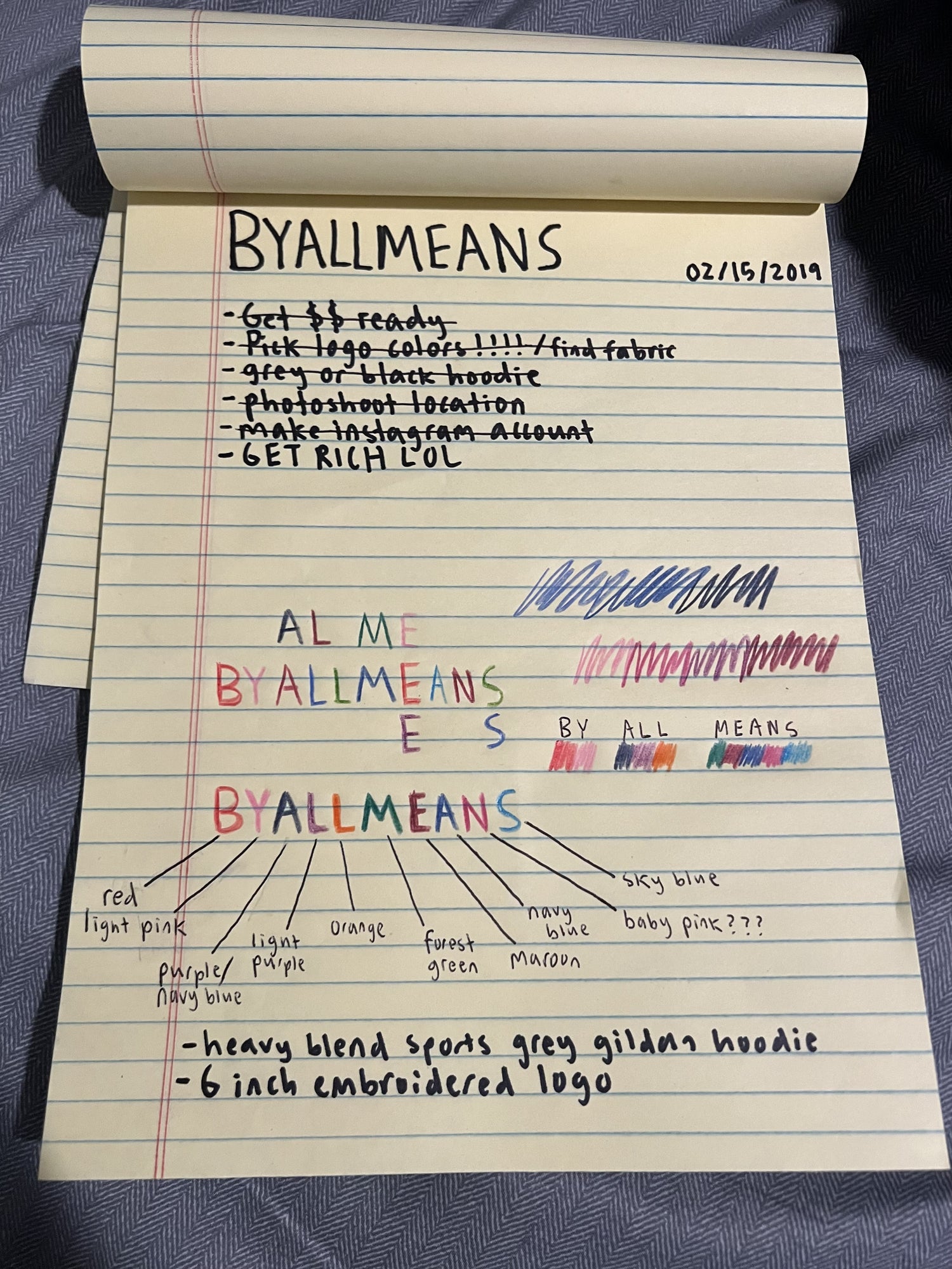Since 2019, By All Means has evolved from an idea on a notepad to a label that embodies staying true to yourself in a world that oftentime lacks originality and authenticity. We aim for each and every one of our pieces to be connected to some sort of expression, experience, or feeling. From selling hoodies out the trunk of a car to shipping out packages all across the world, the goal of By All Means has always been to push the boundaries of what fashion can be.